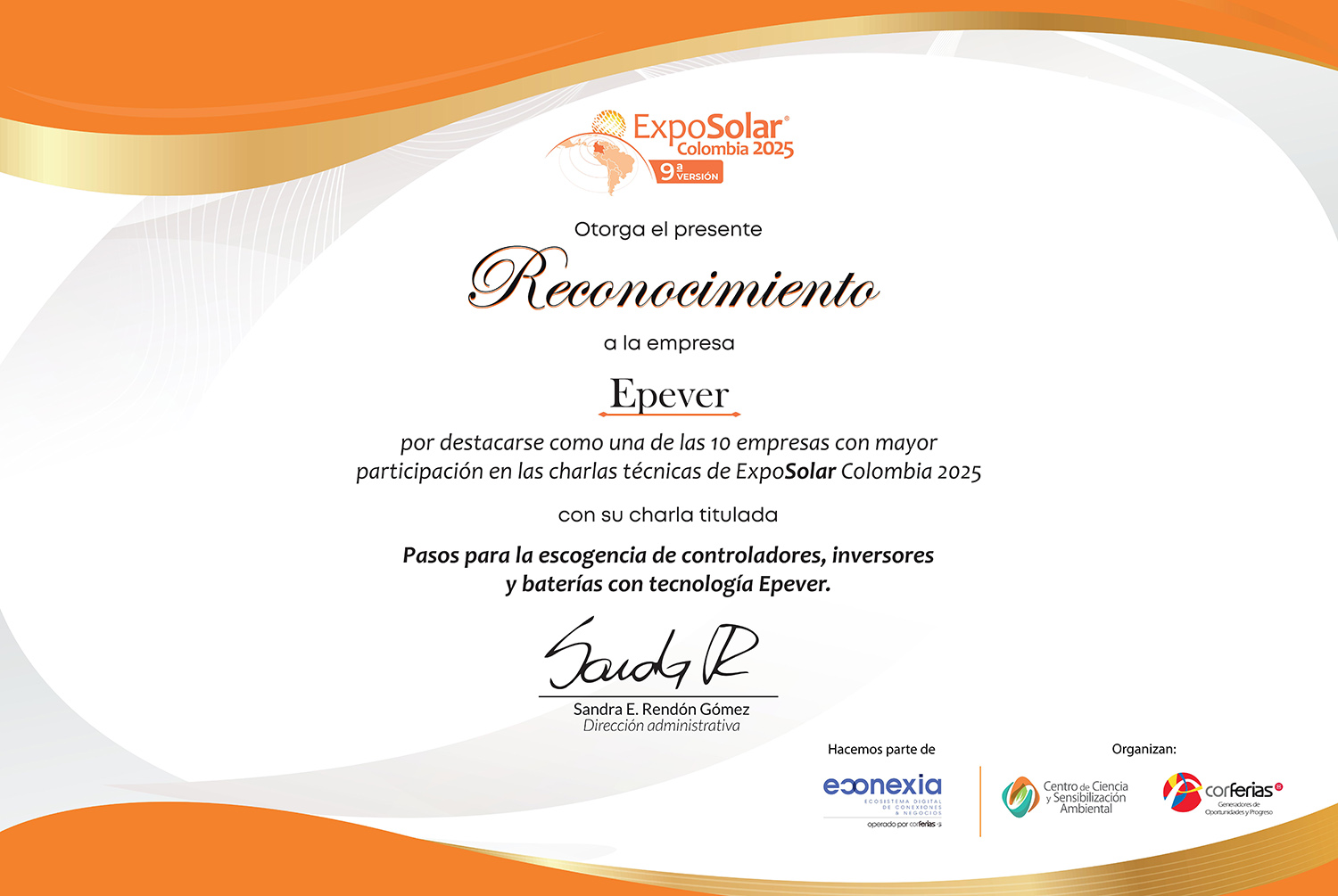 2025年10月16日至18日,汇能精电(EPEVER)携多款光伏储能产品与系统解决方案亮相哥伦比亚太阳能博览会(ExpoSolar Colombia),并在展会技术讲座中荣获“十大最佳演讲”奖项,展现了公司在光伏与储能领域的专业实力与技术影响力。