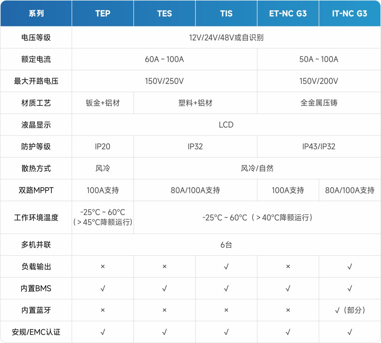 注:1.散热方式:TEP全系风冷散热,TES/TIS系列100A型号带风扇,ET/IT系列80A和100A型号带风扇;2.双路MPPT:TEP系列100A型号支持双路,TES/TIS系列150V/100A型号支持双路,250V/80A和250V/100A型号支持双路;ET系列100A型号支持双路,IT系列80A和100A型号支持双路;3.蓝牙功能:尾缀带BLE的机型(IT-NC G3 BLE系列)支持内置蓝牙。